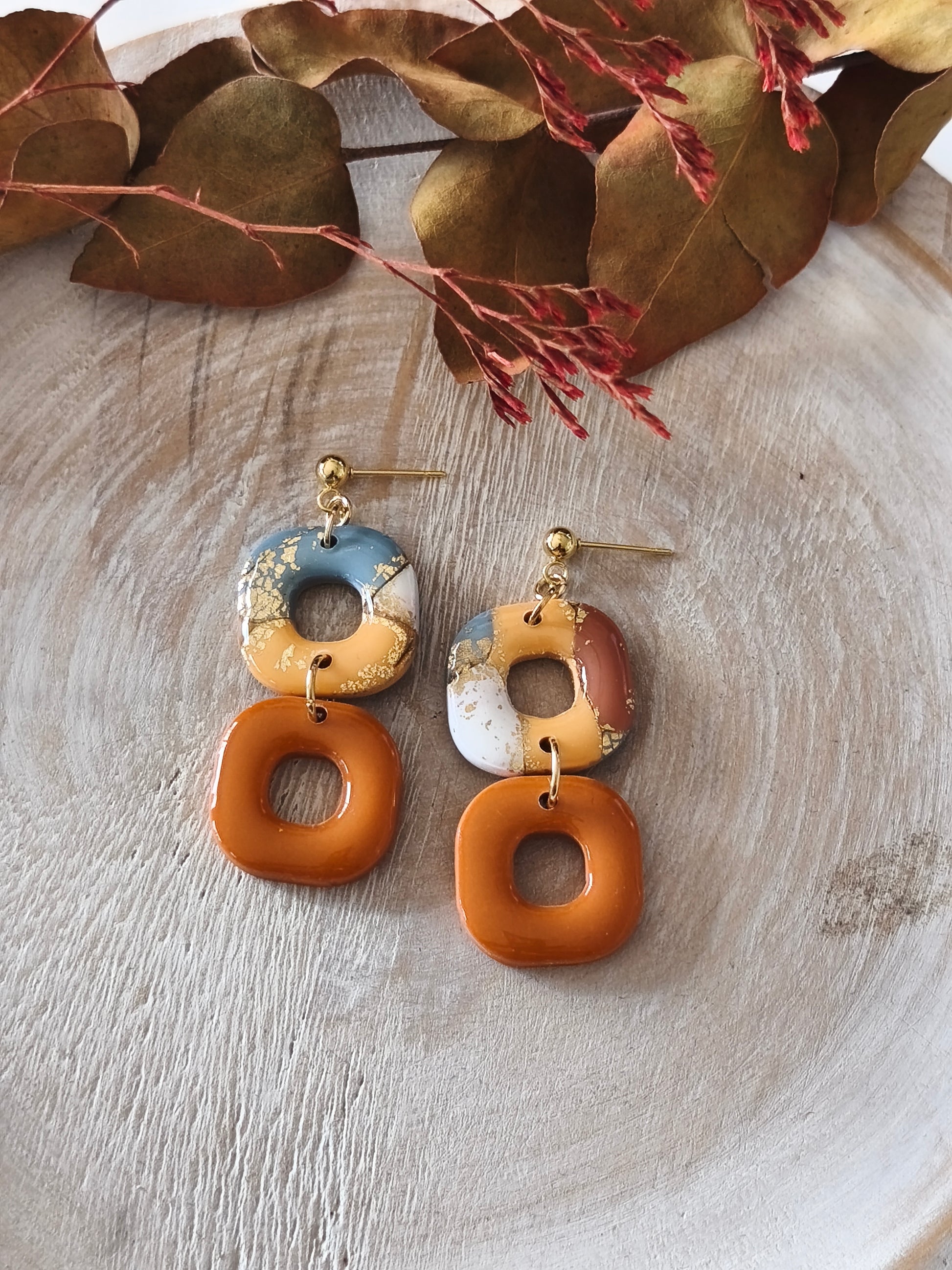 Los pendientes DORIA combinan los tonos tierra con matices blancos, azules y dorados, evocando la suavidad de la arena, la espuma del mar y la luz del sol. Su diseño artesanal, con formas orgánicas y acabado natural, convierte cada pieza en una pequeña obra de arte única.
